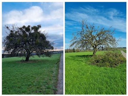 Wenn Misteln auf den Obstbäumen verbleiben, entziehen sie dem Wirtsbaum kontinuierlich Wasser und Nährstoffe. Das schwächt den Baum und kann bei starkem Befall langfristig zum Absterben des Baumes führen. Das wollen wir verhindern!